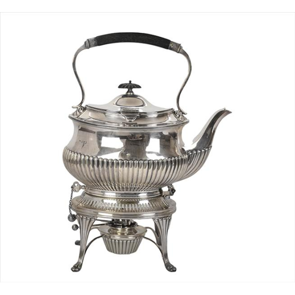 Samovar completo de prata-de-lei inglesa, contraste letra data T, marca do prateiro não-legível, corpo ornamentado com caneluras em relevo, pega superior de madeira. Alt. 35 x 26 x 13cm. Inglaterra, início séc. XX