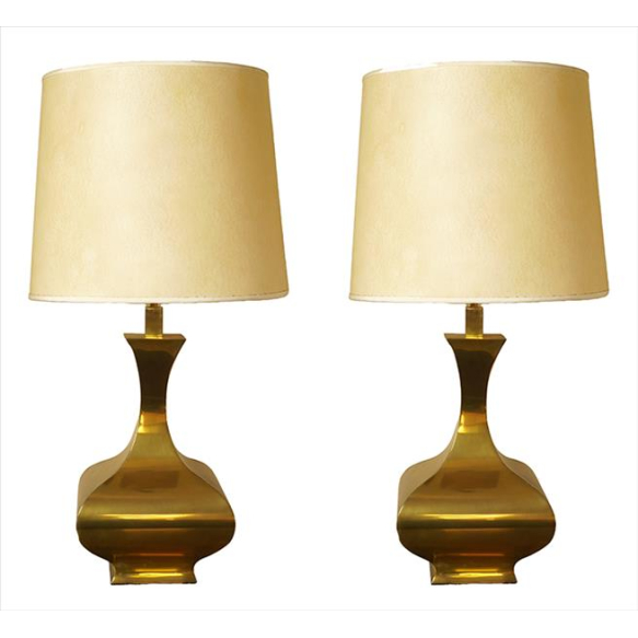 Par de abajures de latão dourado, estilo chinoiserie, cúpulas sintéticas. Alt. 88 x 45cm (total c/ cúpula). Brasil, década 70