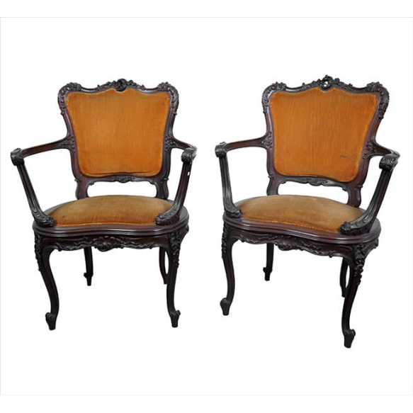 Par de cadeiras de madeira nobre jacarandá, ricamente entalhadas, estilo Luís XV, ornamentadas com guirlandas e motivos florais, assento de molas, forração de tecido na tonalidade ocre. Alt. 91 x 63 x 57cm. Brasil Início séc. XX