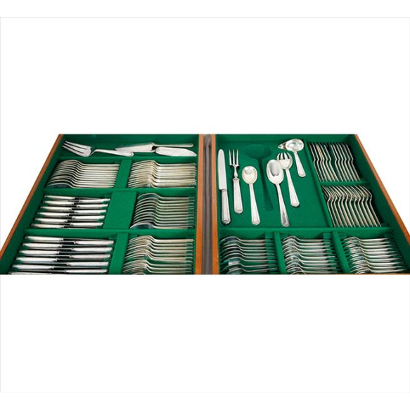 Faqueiro de prata-de-lei, contraste cabeça de mercúrio, para 12 pessoas, contendo 12 garfos jantar, 12 facas, 12 colheres, 12 g. sobremesa, 12 c. sb, 12f. sb, 12 f. peixe, 12 g. peixe, 12 g. escargot, 12 g. ostra, 09 colheres, 09 peças de servir. França seculo XIX /XX