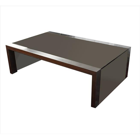 Mesa de centro com estrutura de madeira e aço escovado, tampo superior e laterais de vidro fumê. Alt. 40 x 130 x 80cm. Brasil década de 70