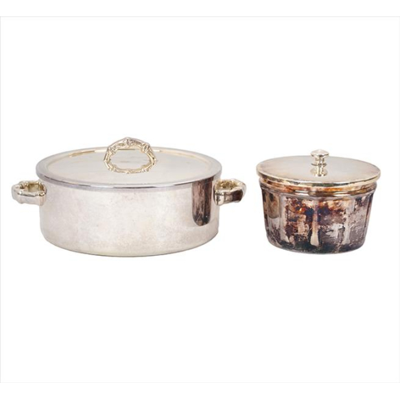 ST JAMES, Lote contendo uma caçarola e um açucareiro de metal espessurado à prata, marca da manufatura sob a base. Alt. 09 x 20 x 15cm e 08 x 08cm.