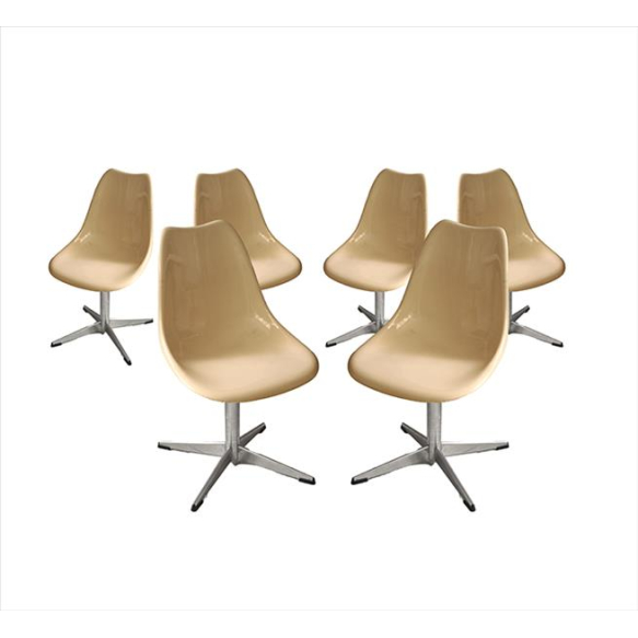 Jogo de 06 cadeiras giratórias com estrutura de metal, assentos de fibra de vidro na tonalidade creme. Alt. 80 x 46 x 51cm. cada. Brasil, década 70