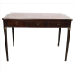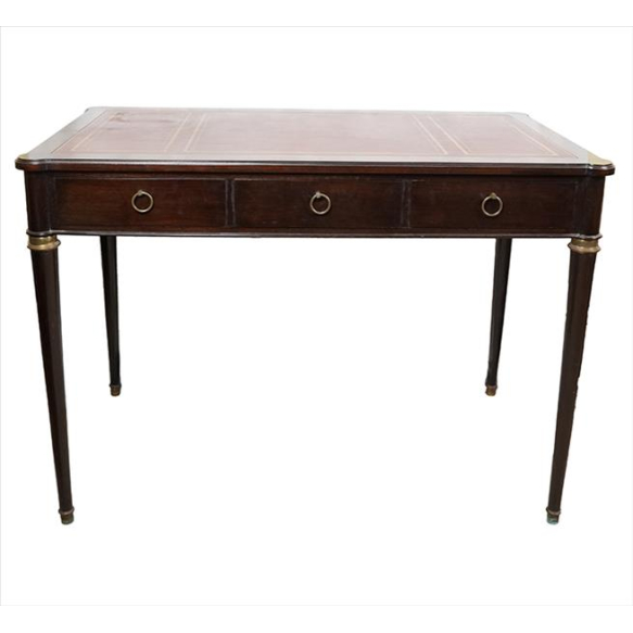 Escrivaninha de madeira, estilo inglês, pernas cilíndricas com detalhes de latão, tampo com inclusão de couro na tonalidade vinho e detalhes dourados, contém 03 gavetas frontais. Alt. 77 x 110 x 64cm.Europa início Séc. XX