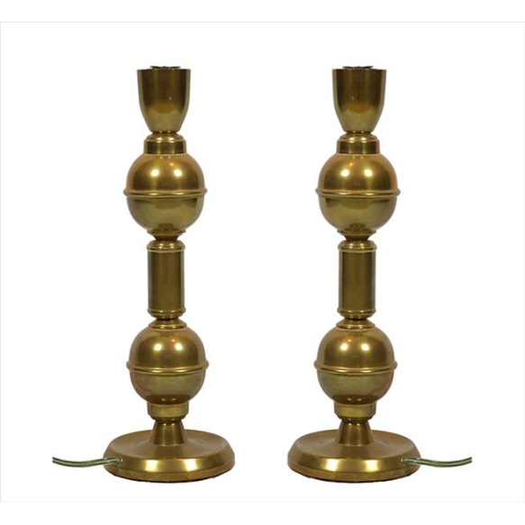 Par de abajures de latão, forma simulando torneado. Alt. 34 x 11cm cada. (faltam cúpulas). Brasil século XX.