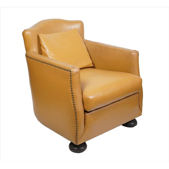 Poltrona baixa estilo club chair, estrutura de madeira, forração de curvin na tonalidade caramelo, terminando em tarraxas. Alt. 66 x 63 x 65cm. Séc. XX