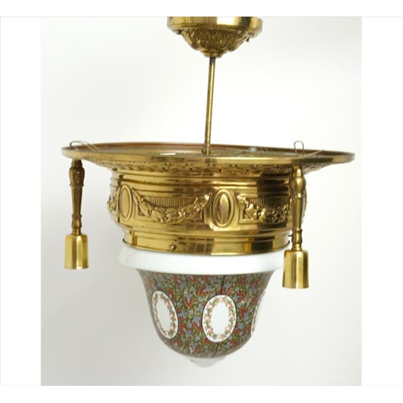 Lustre com estrutura de latão, ornametado com ramagens e caneluras, cúpula central de vidro policromado, contém suporte para 03 lâmpadas. Alt. 55 x 44cm. Europa, início séc. XX (com restauro)