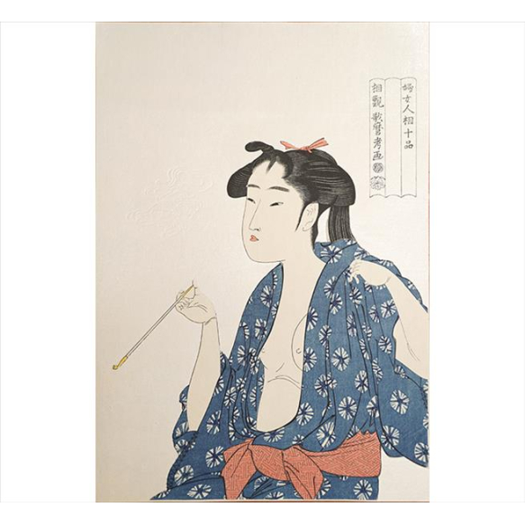 KITAGAWA UTAMARO, Mulher Fumando, Xilogravura Ukiyo-e, assinada. 40 x 27cm. Japão, séc. XX (sem moldura)