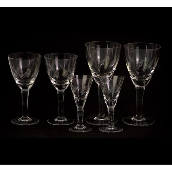 Remanescente de jogo de taças de cristal, ornamentadas com detalhe acidado em baixo relevo, contendo 05 vinho tinto, 07 vinho branco e 07 licor. Total 19 peças (com pequenos bicados)