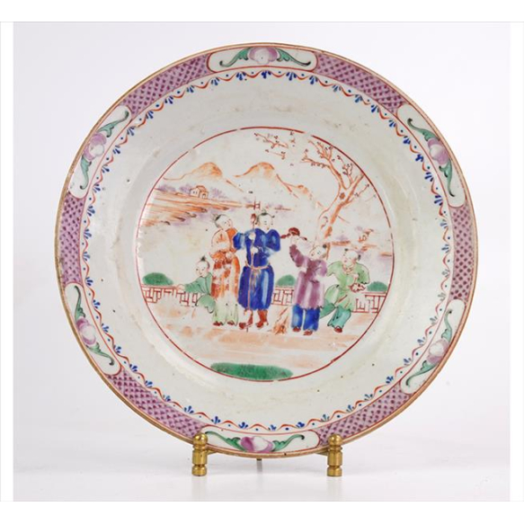 Prato de porcelana oriental esmaltada, dito Cia das Indias, ornamentado com figuras e paisagem lacustre. Diam. 23cm. China, séc. XVIII (com fio de cabelo e pequenos bicados)