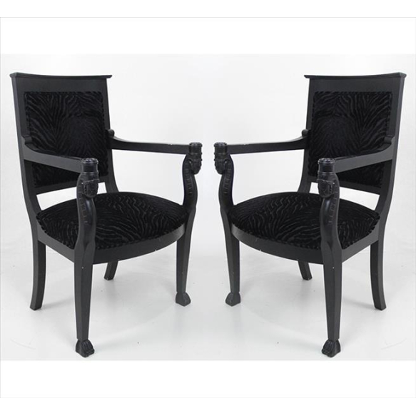 Par de cadeiras de braços, estilo Napoleão III, patinadas na tonalidade preta, forração de veludo na mesma tonalidade, terminações dos braços com figuras estilizadas. Alt. 98 x 63 x 56cm cada. Europa século XX.(com pequenos lascados)