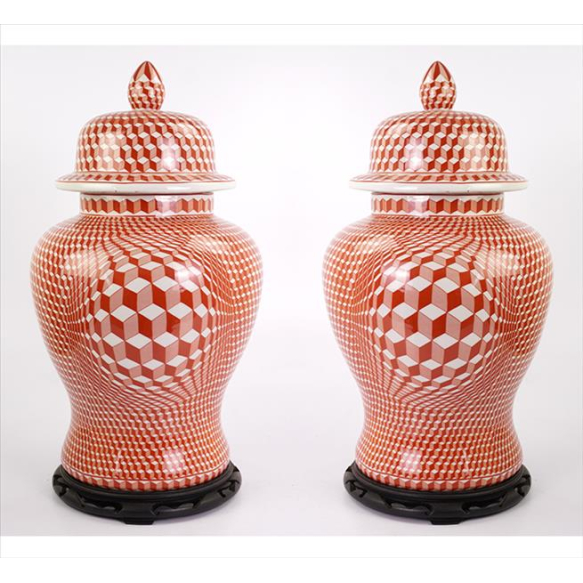 FABRIZIO ROLLO, Par de potiches de porcelana vermelho e branco esmaltada, pintado à mão com motivo Optical, marca Fabrizio Rollo Collection sob a base. Alt. 54 x 30cm (total com base) (base com lascados)