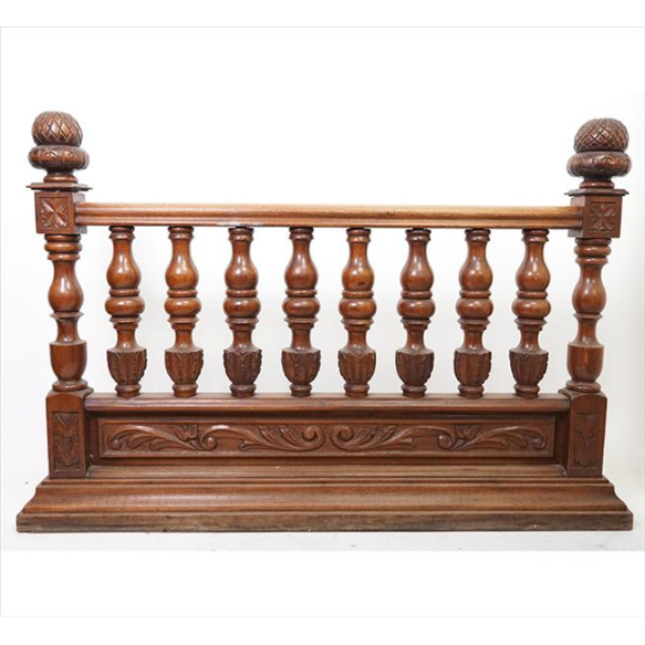 Balaustrada de madeira maciça, hastes torneadas, ornamentada com rosáceas e ramagens entalhadas, extremidades terminando em pinhas. Alt. 88 x 135 x 19cm. Séc. XX