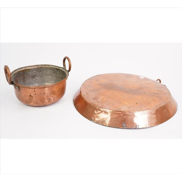 Lote contendo um tacho raso e um fundo de cobre repuxado. 04 x 29cm e 11 x 18 x 17cm. Brasil início séc. XX