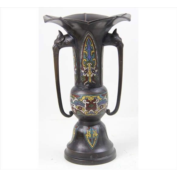 Vaso de bronze comestilo arcaico, alças laterais em forma de animais estilizados, decorado com fino esmalte em reservas, marca sob a base. Alt. 39 x 23cm. China Século XIX.