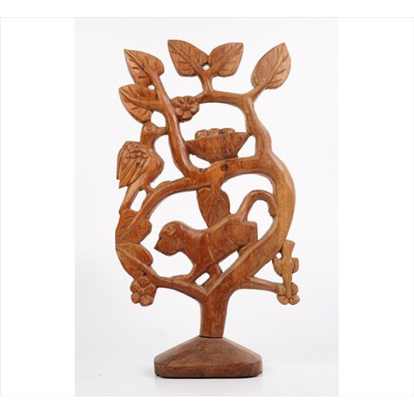 JULIANA JULIÃO, Grupo escultórico de madeira entalhada, representando árvore e macacos, assinada sob a base. Alt. 38 x 21 x 10cm.