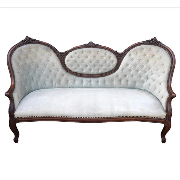 Sofá de madeira nobre, estilo Luis XV, ornamentado com guirlandas e motivos florais finamente entalhados, forração de tecido em tonalidade verde claro. Alt. 102 x 180 x 70cm.