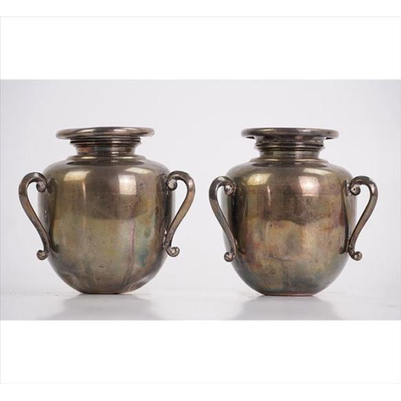 Par de potiches de prata-de-lei, contraste teor 900, forma bojuda. Alt. 11 x 11cm. Europa, séc. XX (com amassados)