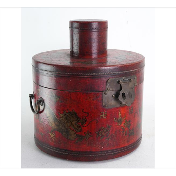 Caixa oriental de madeira com revestimento simulando couro decorado com dragões e ideogramas. Alt. 37 x 33 cm. China, séc. XX
