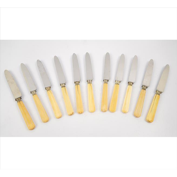 Jogo de facas com cabo de osso natural, lâminas de inox. Comp. 25 x 02cm. Europa, início séc. XX