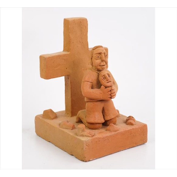 PEDRO CAPELA, Composição com devoto, crucifixo e ex-votos, escultura de barro, assinada. Alt. 17 x 11 x 14cm. Alagoas, 2023