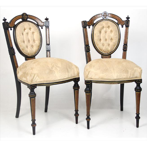 Jogo de 04 cadeiras vitorianas de madeira laqueada, com inclusão de folhas de rádica e detalhes dourados, fina forração de tecido, espaldar com captonne. Alt. 86 x 40 x 40cm.Inglaterra século XIX.(uma delas faltando pequeno adorno da reserva superior / outras com laca desgastada)