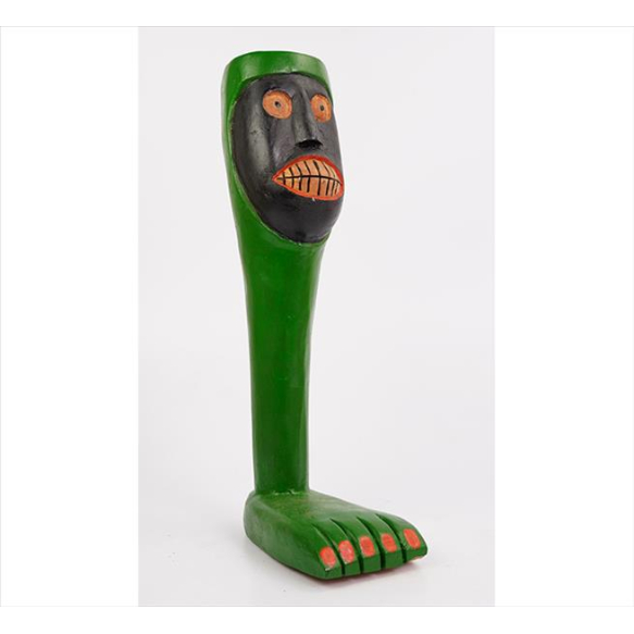 PETRONIO, Escultura de madeira entalhada e policromada, representando figura estilizada, estilo Arte Popular, assinada. Alt. 40 x 10 x 17cm.