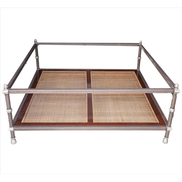 Mesa de centro de ferro patinado, decorada com pinhas nas extremidades, tampo inferior de madeira e palhinha natural, selo da manufatura Vermeil Móveis sob a base. Alt. 46 x 110 x 110cm. (falta tampo superior de vidro)