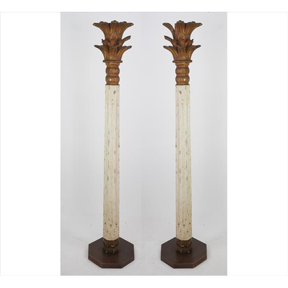 Par de colunas de madeira entalhada, estilo neo-clássico, patinadas e douradas, capitéis ornamentados com ramagens. Alt 190 x 28 x 18cmcm cada. Europa Séc. XIX/XX (falta um detalhe de um dos capités)