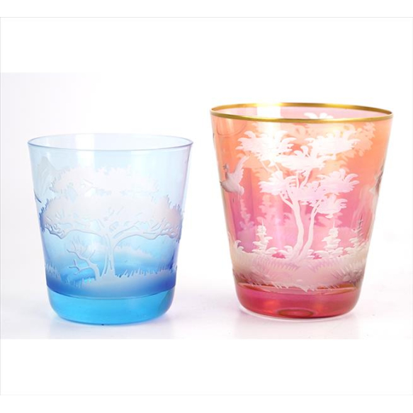 Lote contendo dois copos, sendo um de cristal e um de vidro, o primeiro na tonalidade rubi, ornamentado com paisagem e aves acidados, outro azul com paisagem montanhosa.Europa início séc. XX. Alt. 10 x 09cm e 09 x 08cm, respectivamente