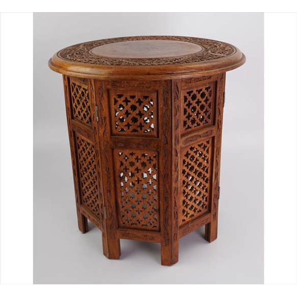 Mesa lateral marroquina, estrutura de madeira entalhada e fenestrada, tampo ornamentado com marcheterie de metal com motivo floral. Alt. 48 x 44cm. Séc. XX