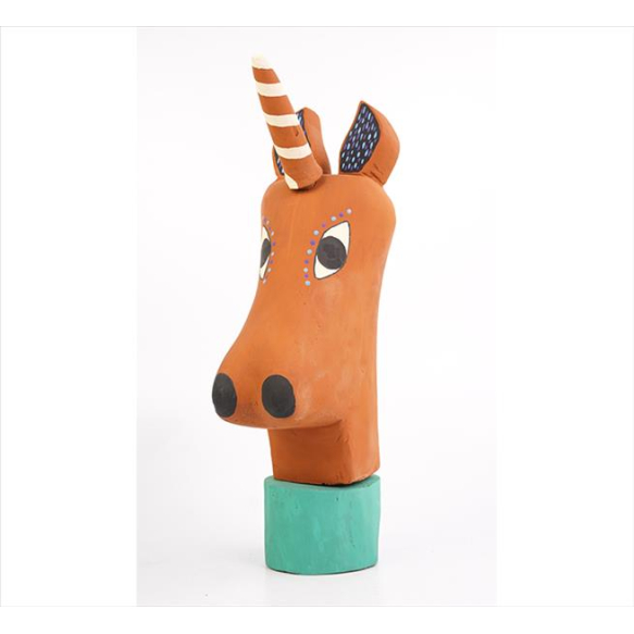 ZÉ CRENTE, Escultura de madeira entalhada e policromada, representando figura de cavalo/unicórnio, estilo Arte Popular, assinado sob a base. Alt. 44 x 10 x 22cm.