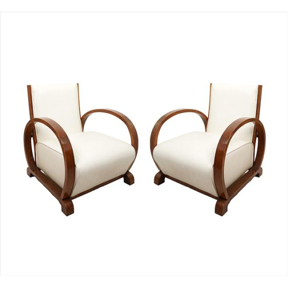 Par de poltronas de madeira, estilo Biedermeier, forração de couro na tonalidade branca. Alt. 71 x 61 x 70cm cada. Europa séc. XX