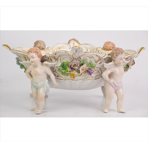 DRESDEN, Centro de mesa de porcelana ricamente ornamentado com figuras de querubins e motivos florais, marca da manufatura sob a base. Alt. 14 x 33 x 26cm. Alemanha, séc. XX (com pequenos bicados)