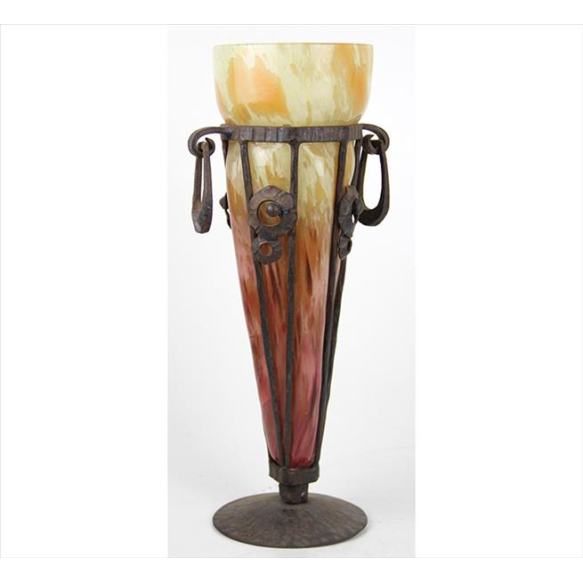 SCHINEIDER , FLOREIRO de patê de verreem múltiplas tonalidades, estrutura de ferro forget com características de Majorelle. Alt. 33 x 15cm. França, início séc. XX ( com trincado )
