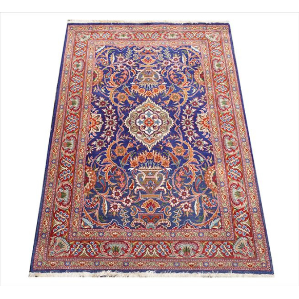 Tapete Isfahan, decoração floral clássica com arabescos e palmetas dispostos simetricamente em composição espelhada, medalhão central geométrico sobre campo azul profundo, borda tripla com faixa principal em vermelho ornada com cartuchos e flores em sequência contínua, 138 x 100 cm = 1,38 m² (precisa refazer franja)