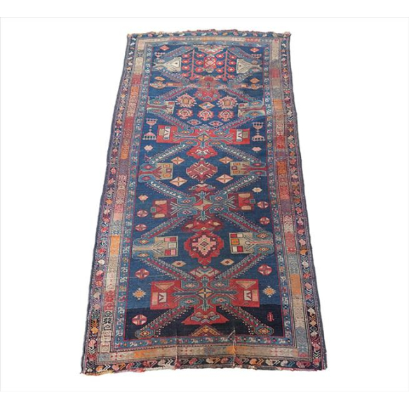 Tapete caucasiano Karabagh, decoração axial com elementos geométricos estilizados, motivos heráldicos e simbólicos com medalhões em losango interligados por figuras totêmicas, campo azul marinho com desenhos em vermelho, marfim e verde, borda tripla com faixa principal de motivos florais estilizados em fundo escuro, 262 x 128cm = 3,35m², ca. 1900 (no estado, com rasgos, necessita refazer franja e cordão)