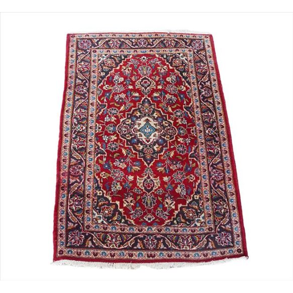 Tapete Kashan, decoração clássica persa com composição floral do tipo Shah Abbas, incluindo palmetas, rosetas e ramos sinuosos finamente desenhados, campo vermelho com medalhão central poligonal em marfim e azul-claro ladeado por flores em arranjo radial, borda tripla floral composta por faixa principal azul-escura com palmetas espelhadas e folhas lanceoladas, e faixas secundárias em azul-claro e marfim com sequência de rosetas estilizadas, 167 x 104cm = 1,74m² (precisa refazer franja e cordão)