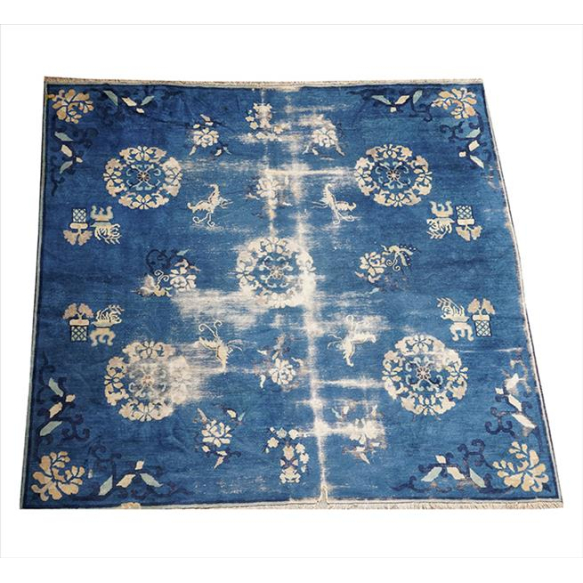 Tapete chinês Pekuing, decoração em disposição livre com grandes florões circulares alternados a motivos florais isolados e figuras de animais estilizados sobre campo em tonalidade predominante azul médio, cantos marcados por ramos florais sinuosos e acentos em bege, marfim e azul claro; moldura estreita simplificada junto às extremidades; 252 x 272 cm = 6,85 m²; primeira metade do século XX. (no estado, com partes laterais danificadas e furo no campo)