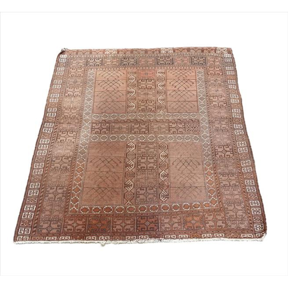Tapete turcomano, decoração com motivos geométricos repetidos em compartimentos dispostos em quadrantes, tonalidade predominante castanho-terroso com campo compartimentado, borda tripla com faixas geométricas tipo gul e ornamentos em gancho. 199 x 154 cm = 3,06 m², ca. 1950. (precisa refazer franja)
