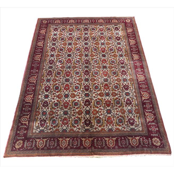 Tapete tabriz, decoração composta por palmetas, rosetas, flores estilizadas e folhas em arabescos contínuos, tonalidade predominante cinza-clara no campo com repetição axial de motivos florais, borda tripla com faixa central vinho ornada por cartelas florais e hastes curvas, dimensões 277 x 195cm = 5,40m². Séc. XX