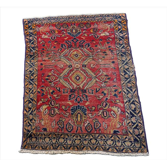 Tapete tribal do Irã ocidental, região de Hamadan, provável produção de aldeia como Zandjan ou Hoseinabad, campo vermelho-coral com medalhão central losangular escalonado ladeado por palmetas rústicas, botehs assimétricos e ramos florais estilizados, borda principal em fundo azul marinho com lianas contínuas entre cartuchos florais, paleta viva com tons de vermelho, azul escuro, dourado, rosa e bege, desenho espontâneo com variações laterais e assimetrias típicas de tecelagem aldeã, desgaste moderado, necessita refazimento de franjas e cordão, 148 x 100 cm = 1,48 m² (Rape / precisa refazer franja e cordão)