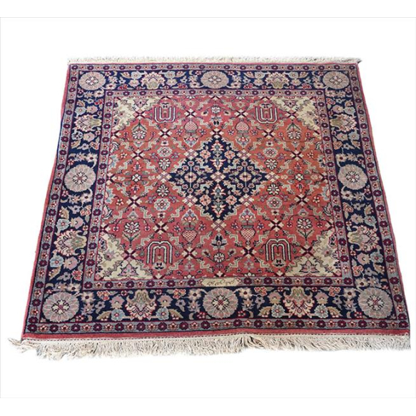 Tapete Sarouk, decoração floral com disposição em treliça sobre fundo vermelho-rosado, com presença de buquês, flores estilizadas e pequenos motivos de rosetas, medalhão central em formato de losango com detalhes simétricos florais em azul-marinho e bege, borda tripla com faixa principal floral em fundo azul-escuro e detalhes em palmetas e flores circulares, 162 x 146 cm = 2,36 m²