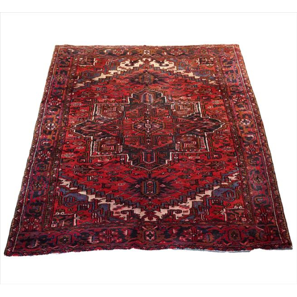 Tapete tribal Heriz, decoração com medalhão geométrico central ladeado por motivos angulares e elementos estilizados, campo com tonalidade predominante vermelho carmim, borda com sequência de rosetas e volutas, 278 x 210 cm = 5,84 m² (sem franjas)