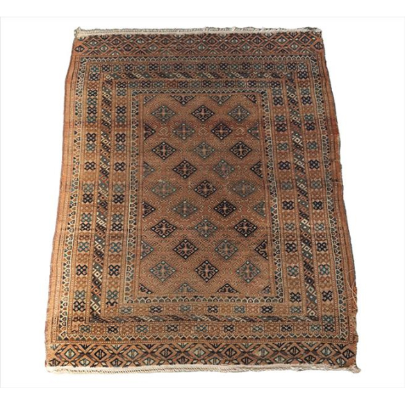 Tapete persa, decoração geométrica com motivos repetitivos gul em padrão tipo Tekke, tonalidade predominante castanho com acentos em azul e preto, borda múltipla com ornamentação geométrica, 140 x 107 cm = 1,49 m², ca. 1950. (precisa refazer franja e cordão)