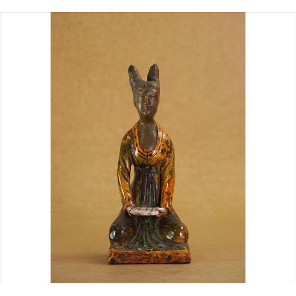 Escultura Tang de cerâmica esmaltada, representando figura feminina ajoelhada com tabuleiro. Alt. 24 x 10 x 9 cm. (no estado)