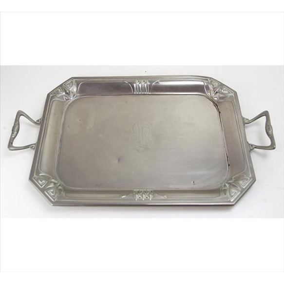 Travessa de metal, estilo e época Art-Deco, marca da manufatura WMF sob o contraste I/O, 54 x 33cm. Alemanha, início séc. XX (reserva central com monograma E. R. F)