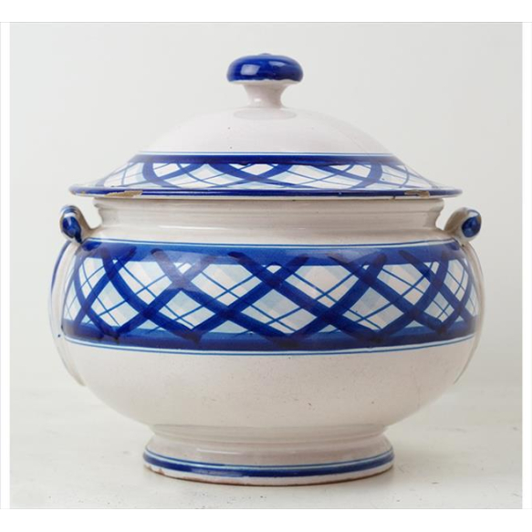 Sopeira de cerâmica esmaltada nas tonalidades azul e branco, pegas laterais estilizadas. Alt. 25 x 24cm. Séc. XX (com fios de cabelo e pequenos bicados)