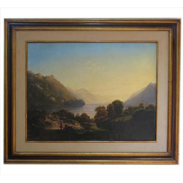 Quadro da escola européia do séc. XVIII/XIX, monograma do artista G.M, Paisagem com Lago e Montanhas, OST, ACID, 53 x 68 cm.