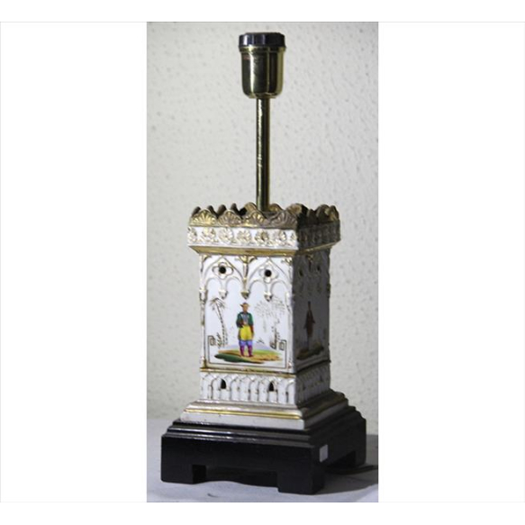 VIEUX PARISluminária de porcelana esmaltada, decorada com figuras orientais e douração, base de madeira. França séc. XIX. Alt. 39 x 14cm (total)
